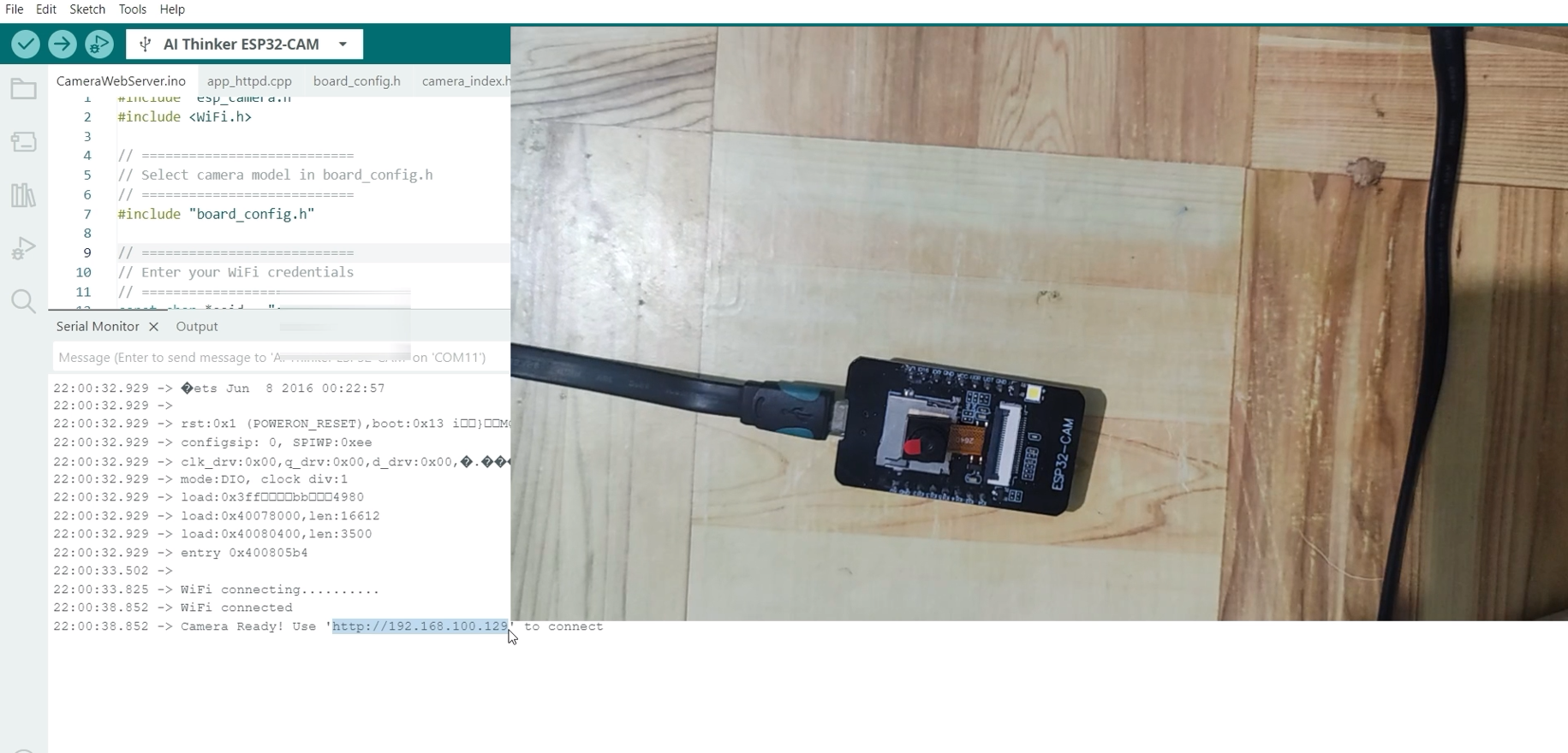 - Go back to the CameraWebServer.ino file and change the WiFi credentials