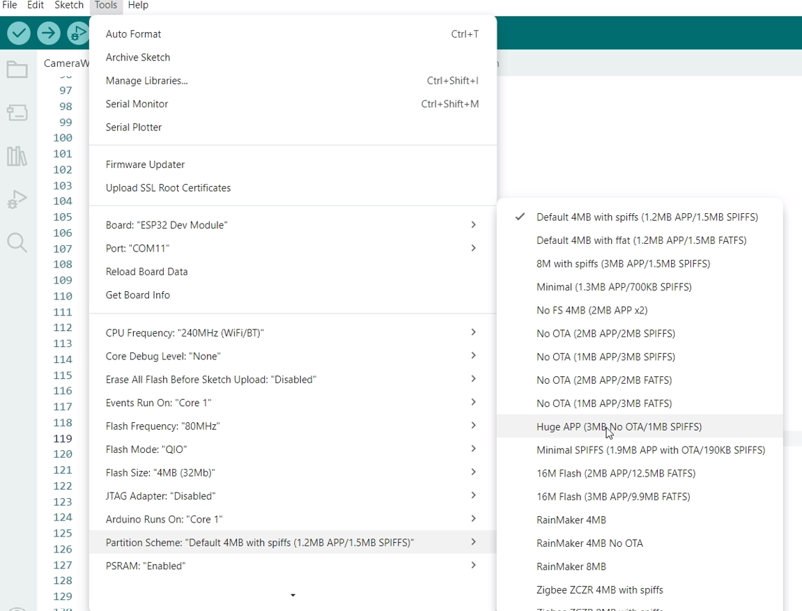 - Click File -> Examples -> ESP32 -> Camera -> CameraWebServer